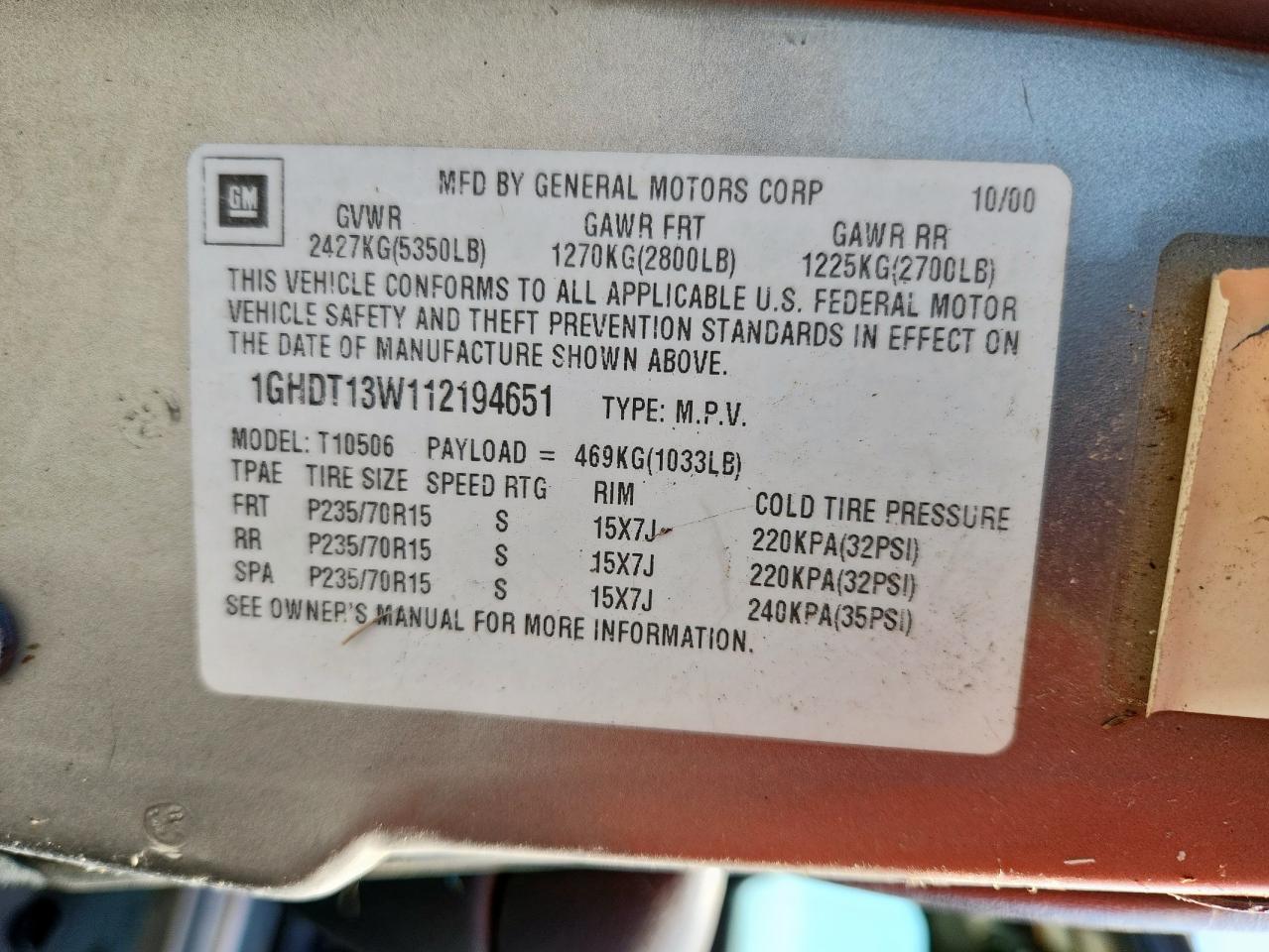 2001 Oldsmobile Bravada 1GHDT13W112194651