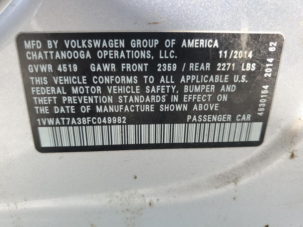 2015 Volkswagen Passat S 1VWAT7A38FC049982