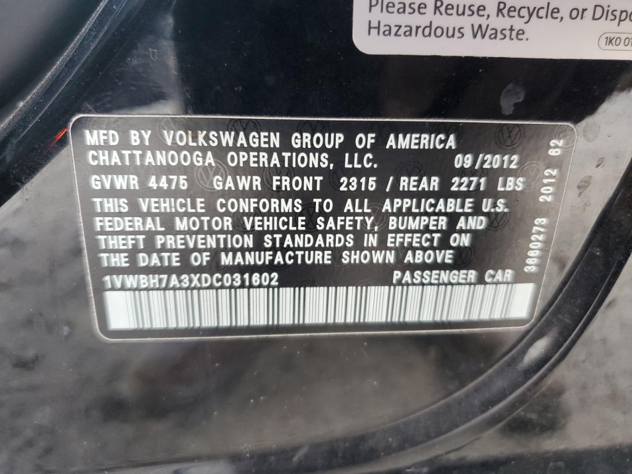 2013 Volkswagen Passat Se 1VWBH7A3XDC031602