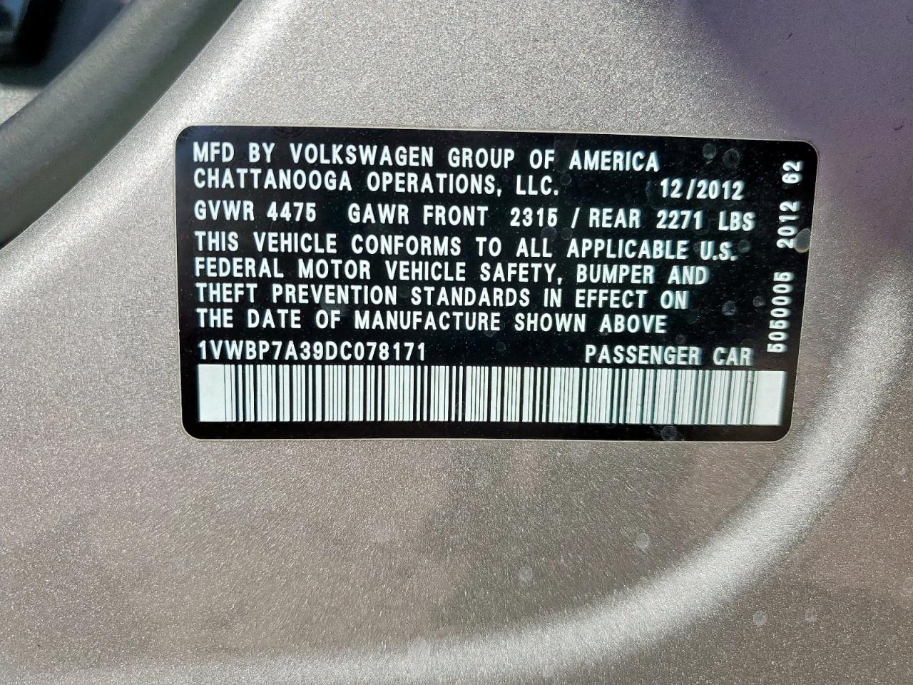 2013 Volkswagen Passat Se 1VWBP7A39DC078171