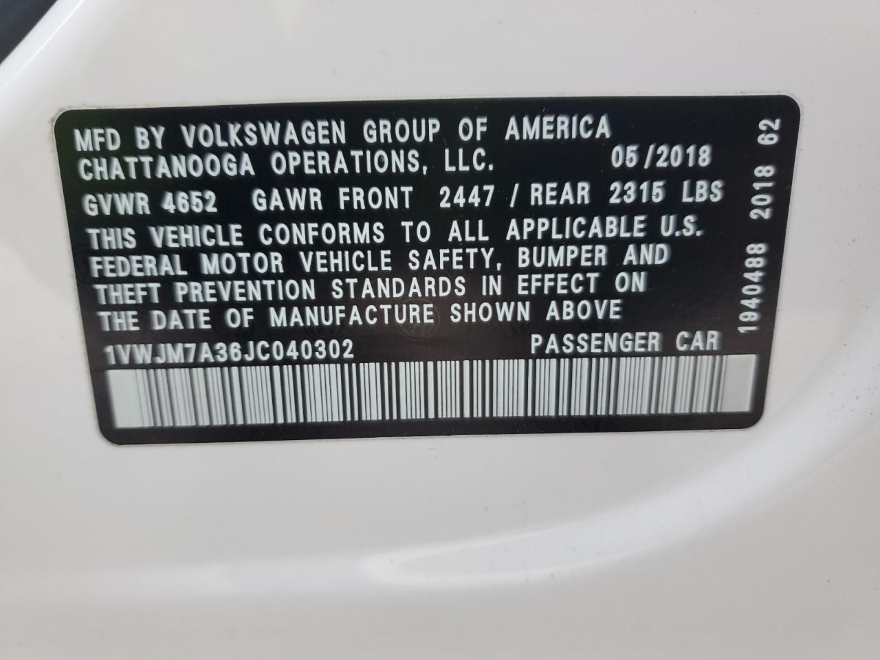 2018 Volkswagen Passat Gt 1VWJM7A36JC040302