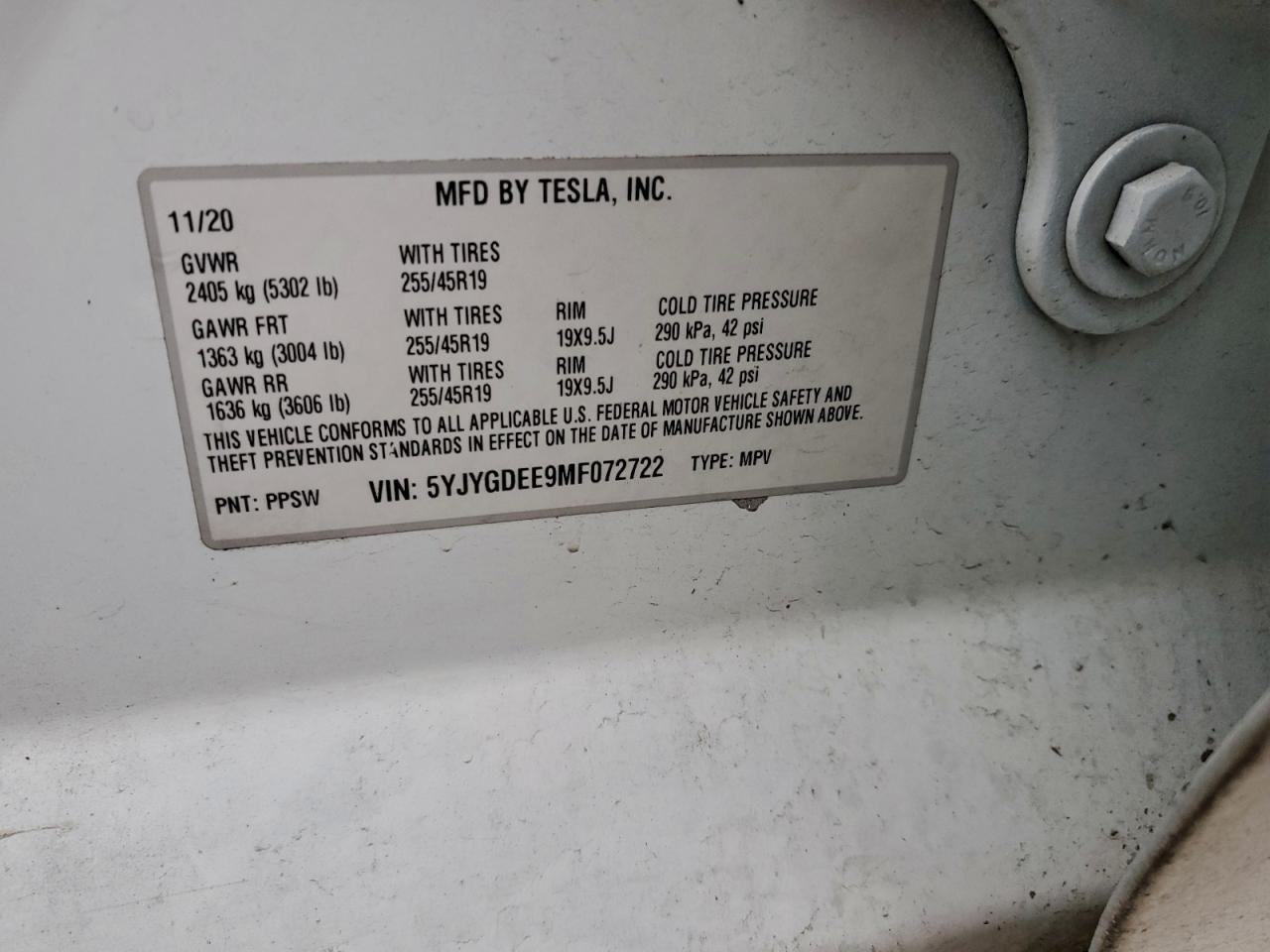 2021 Tesla Model Y 5YJYGDEE9MF072722