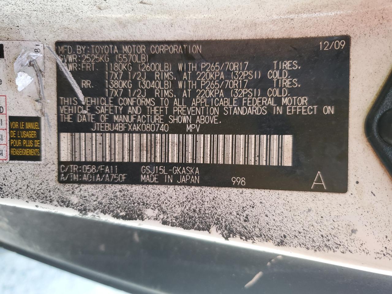 2010 Toyota Fj Cruiser JTEBU4BFXAK080740
