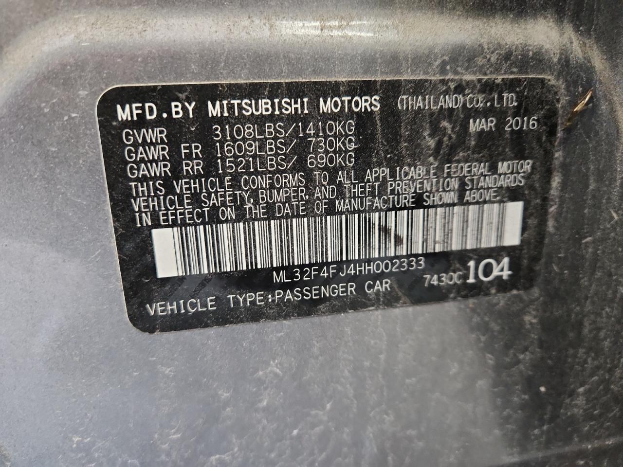 У нас вы можете заказать автомобиль Mitsubishi Mirage VI 2017 года выпуска с пробегом 104346 миль, цвет серый, с двигателем 1.2l 3, коробкой передач автоматическая, привод - передний, топливо - бензин . Транспортное средство продается на аукционе и доступно для доставки в Беларусь, местонахождение ТС - Wi - Milwaukee South, Franklin, Wisconsin, США. Состояние - заводится и едет. Vin ТС - ML32F4FJ4HH002333.