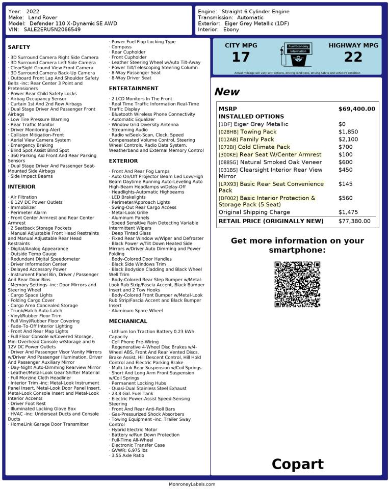 Мы специализируемся на подборе и доставке автомобилей и других транспортных средств с аукционов IAAI/Copart в США. Оставьте заявку и мы вышлем расчет на доставку автомобиль Land Rover Defender II 2022 SALE2ERU5N2066549 под ключ в Беларуси/РФ.