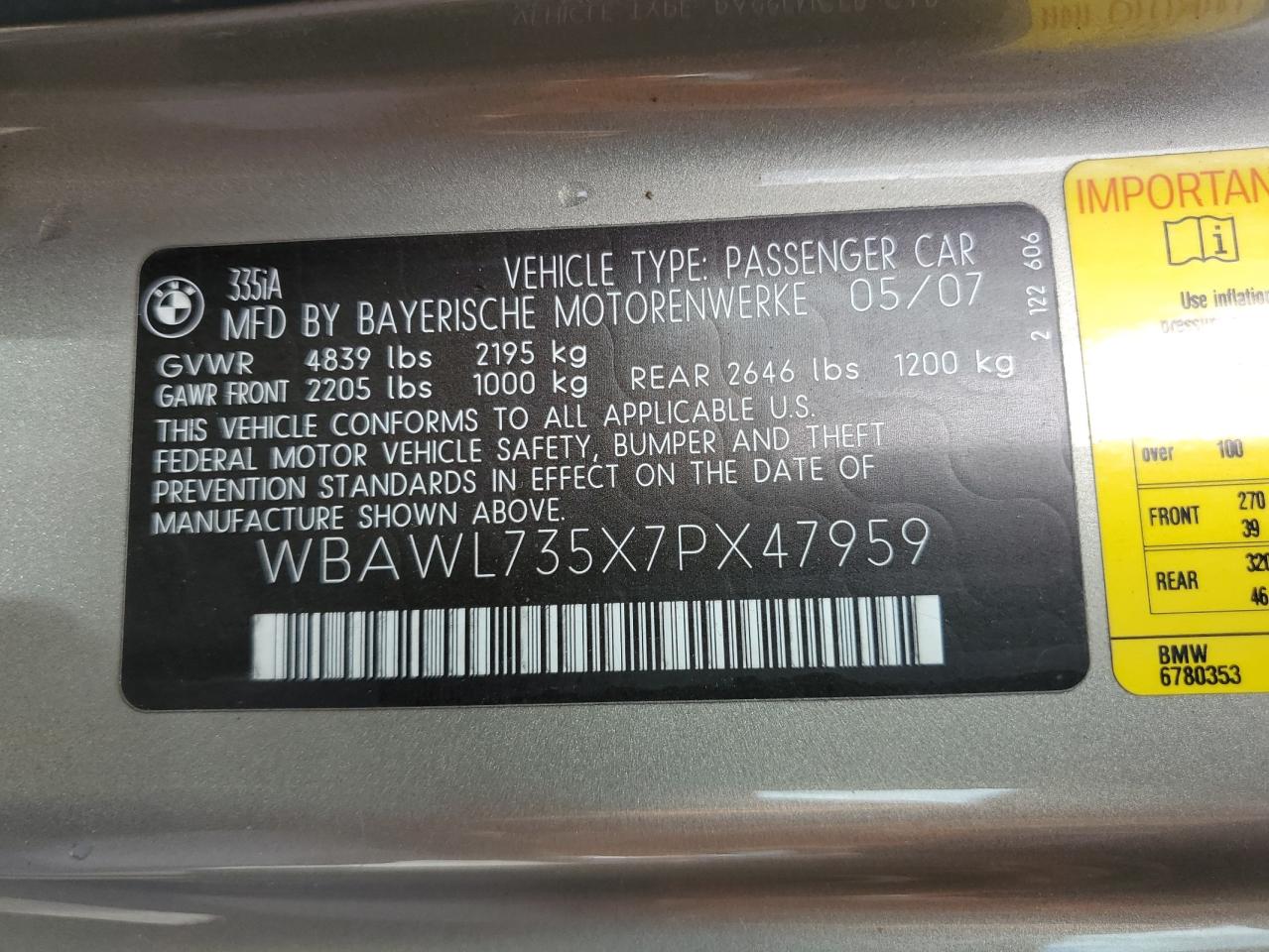 2007 BMW 335 I WBAWL735X7PX47959